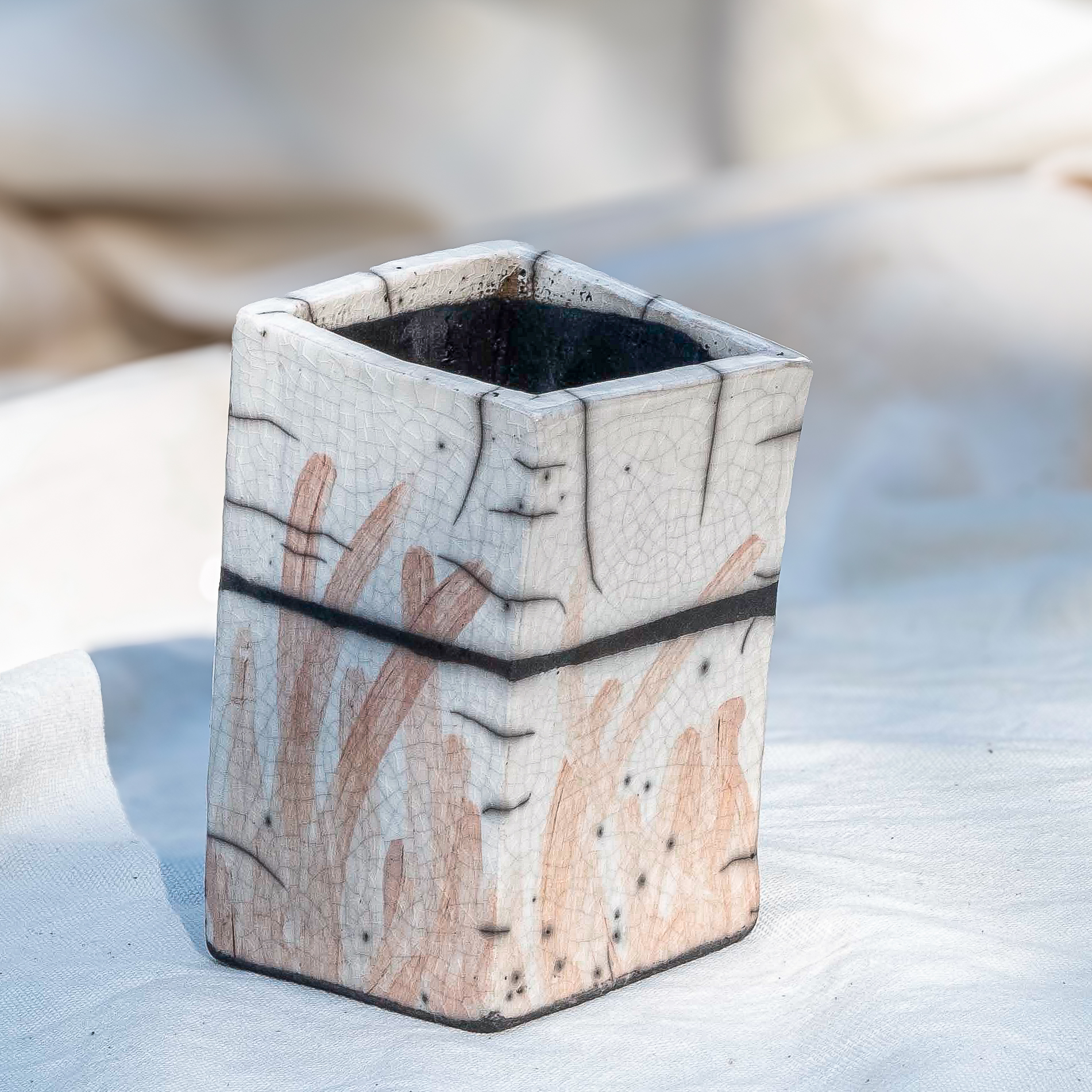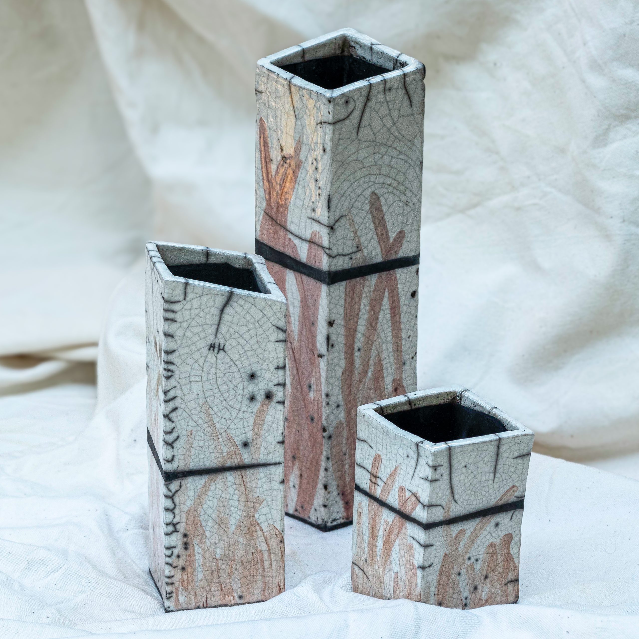 Prismas modelados mediante láminas con pasta nacional, aplicación de Tierra Sigilata con óxido de fierro rojo, esmalte transparente, horneada en raku y carbonizada con viruta de madera en tambor metálico.